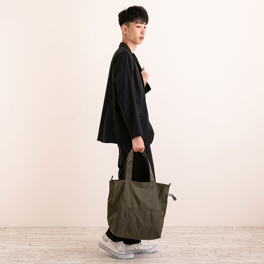 ポケット充実、大きめサイズのエコバッグ。コンパクトに収納できるので、毎日のお買い物や旅行先で荷物が増えてしまった時など、様々なシーンで大活躍。トップファスナーがついているので、中身がこぼれ落ちる心配もありません。