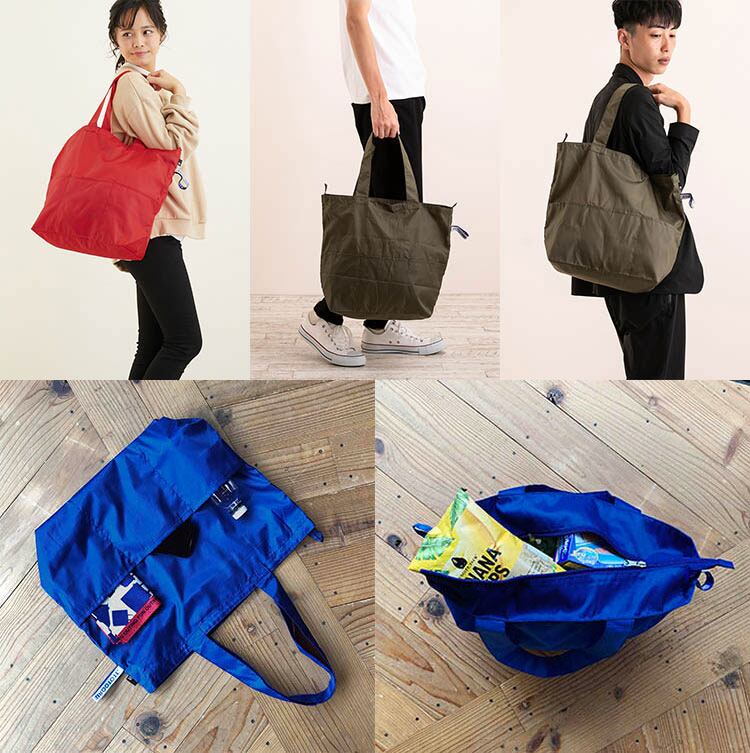 ポケット充実、大きめサイズのエコバッグ。コンパクトに収納できるので、毎日のお買い物や旅行先で荷物が増えてしまった時など、様々なシーンで大活躍。トップファスナーがついているので、中身がこぼれ落ちる心配もありません。