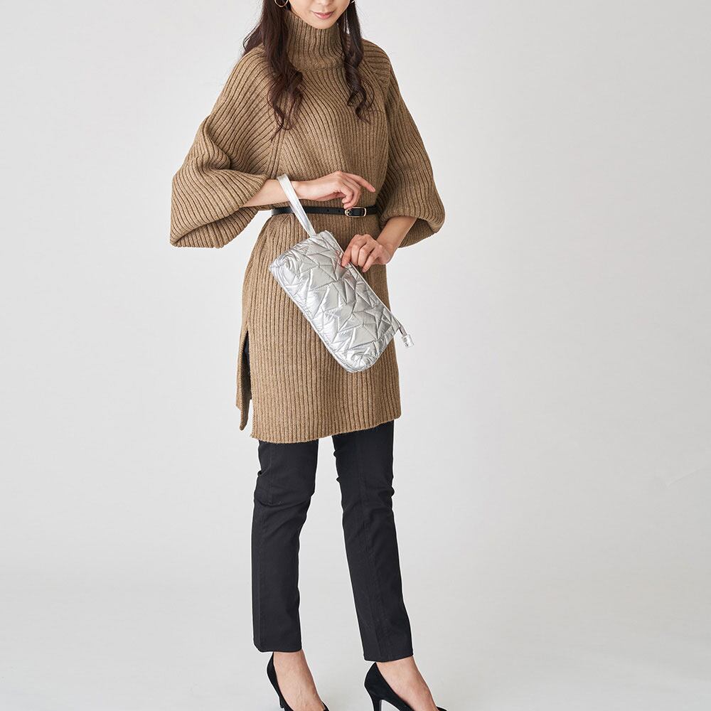 マットな光沢感の素材を使用した、星をモチーフにした幾何学キルティングポーチ。ストラップ(持ち手)付きでスマートに持ち運びができます。バックの中に入れて、バッグインバッグとしても使用できます。