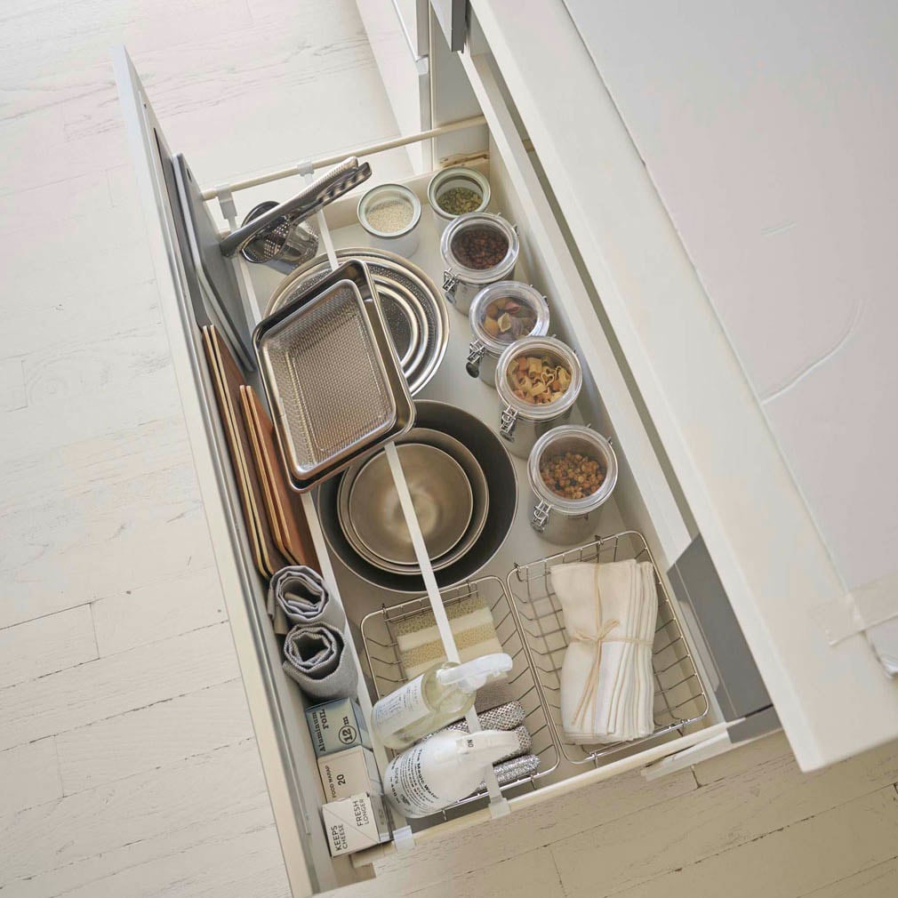 置き場所に困る鍋蓋を立てて収納できます。バーの段差を利用して上に物を置いたり、まな板やトレー、ラップを立てて収納したり、下に物を収納することもできます。スプレーをバーに掛けて収納もできます。引き出しの仕切りに使うと、転倒しやすい調味料やストック類も倒れません。