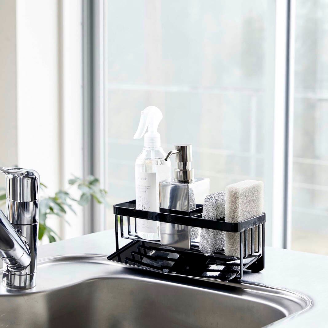 水が流れる構造のトレーでスポンジやボトルからでる水を直接シンクの中に流せます。トレーは前と後ろどちらからも取り付けできるので、スポンジとボトルを左右お好きな位置に配置できます。
