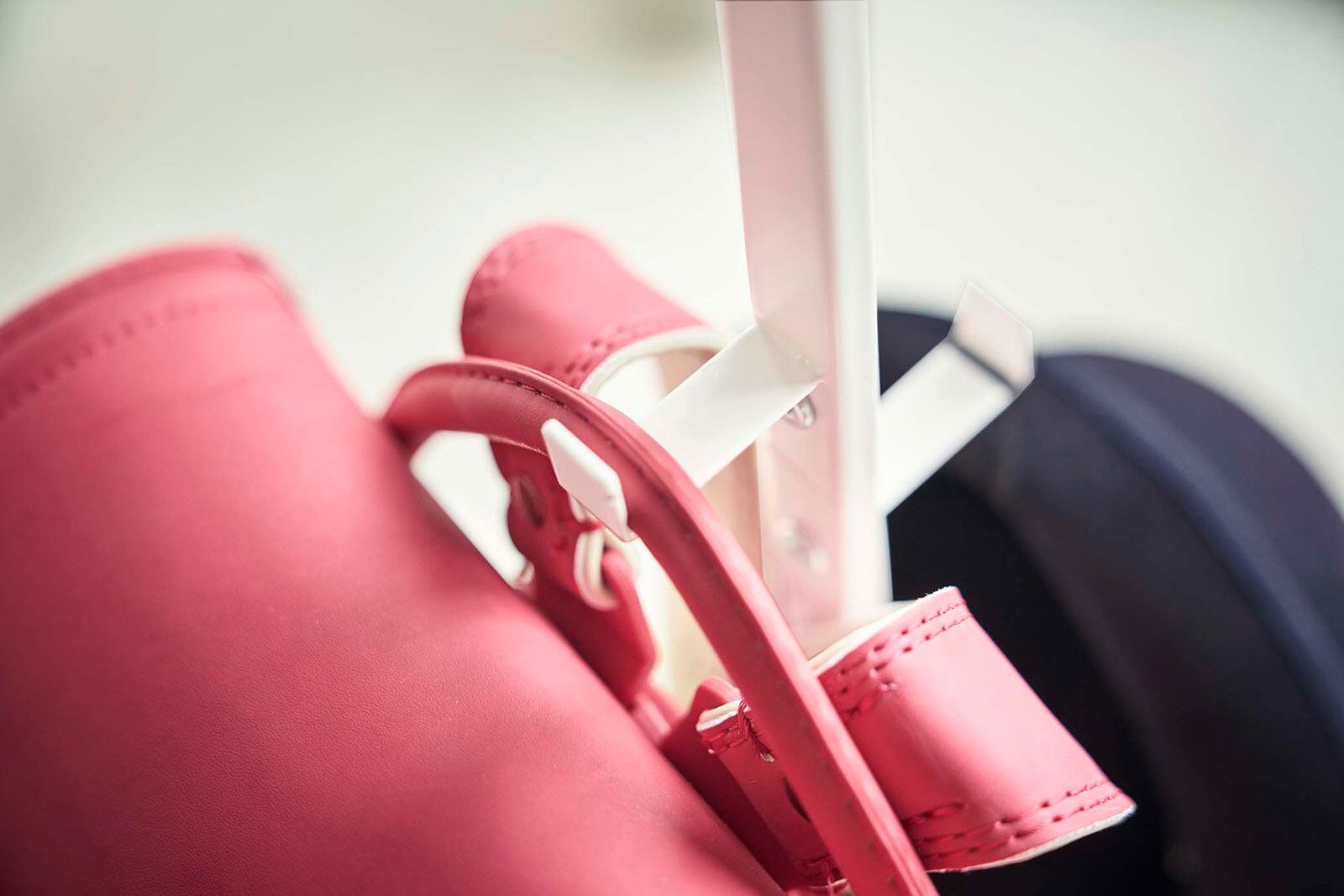 必要なものを揃えて収納できるハンガーラック。左右に3つの大きなフックがあり、ランドセルやお稽古バッグなどを収納できます。付属のフック小には小物類を、パネルには時間割やメモなどを貼り付けられて便利です。