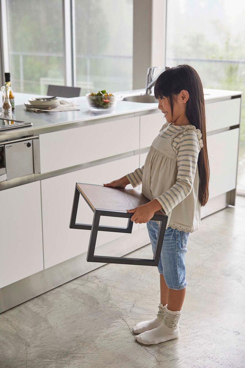 高くて届かなかったところにしっかり届くおしゃれな踏み台。ワイドな天板だから、小さなお子様でも安心して歯磨きやキッチンのお手伝いができます。