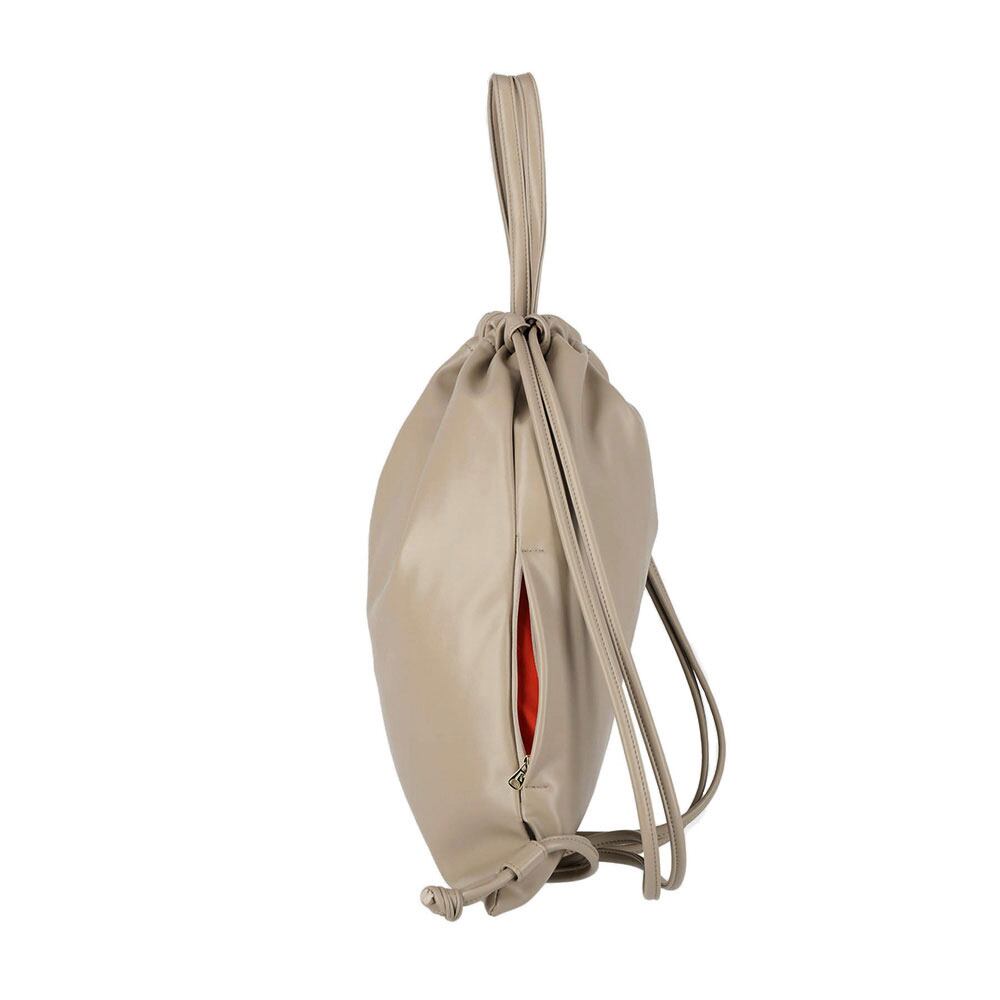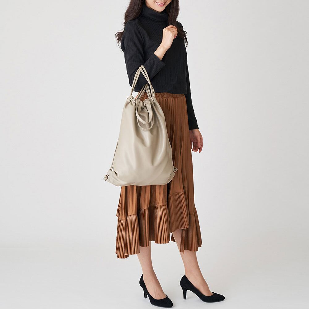 柔らかいフェイクレザーの生地感が魅力、トートにもリュックサックにもなる2wayトートバッグ。口元を縛らずフラットなトートバッグとしても使用できます。本革のような質感で、上品でしっかりした雰囲気に。汚れや水滴なども拭き取りやすく機能的です。