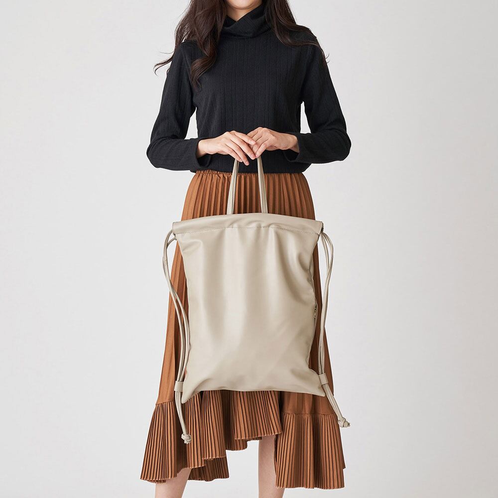 柔らかいフェイクレザーの生地感が魅力、トートにもリュックサックにもなる2wayトートバッグ。口元を縛らずフラットなトートバッグとしても使用できます。本革のような質感で、上品でしっかりした雰囲気に。汚れや水滴なども拭き取りやすく機能的です。