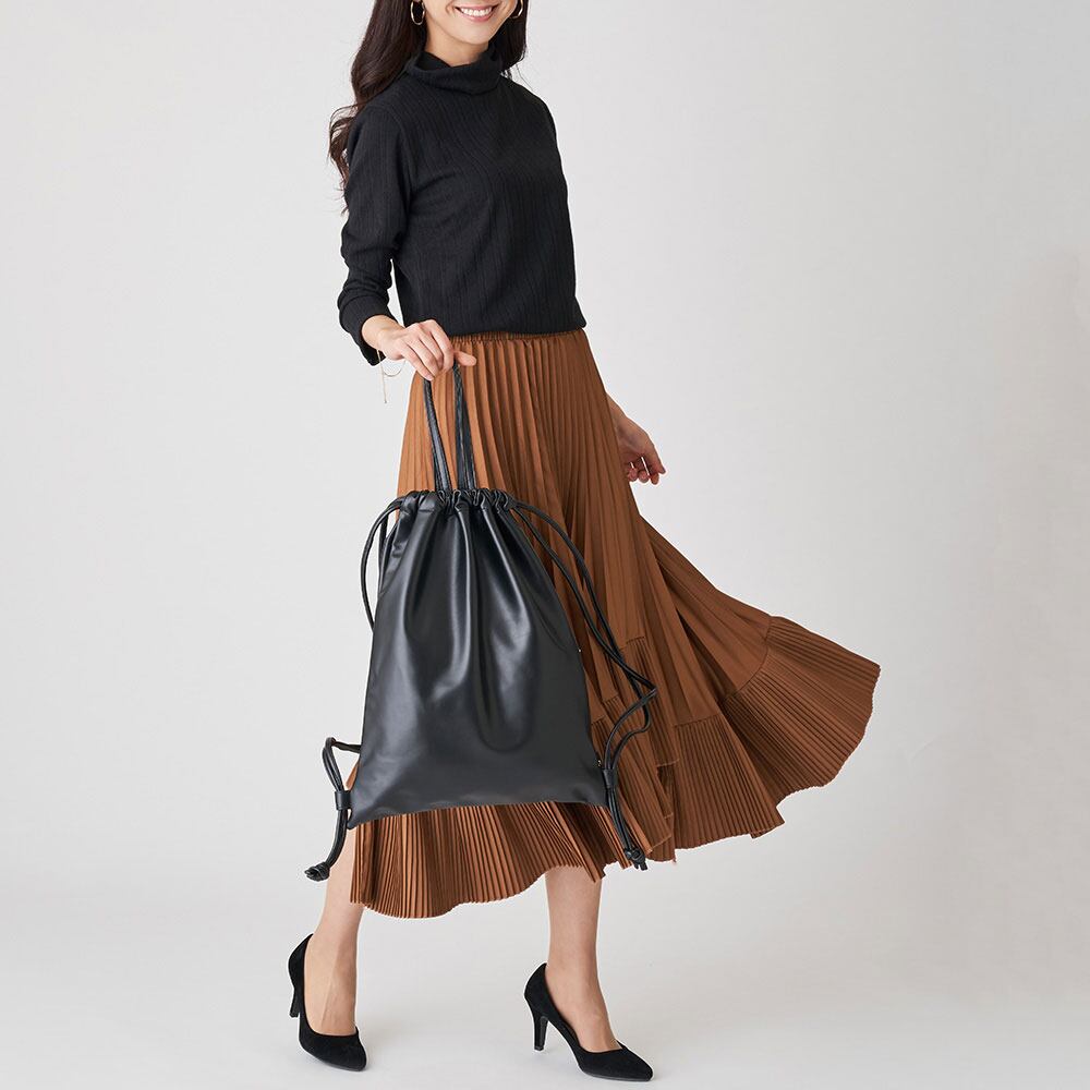 柔らかいフェイクレザーの生地感が魅力、トートにもリュックサックにもなる2wayトートバッグ。口元を縛らずフラットなトートバッグとしても使用できます。本革のような質感で、上品でしっかりした雰囲気に。汚れや水滴なども拭き取りやすく機能的です。