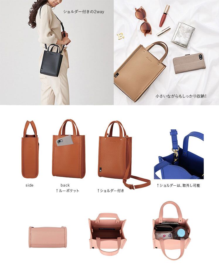 取り外し可能なショルダー付きで、トートバッグ・ショルダーバッグの2wayで使えます。ショルダーは長さ調整ができるので、斜め掛けも可能です。本革のような上質な質感、上品なフォルムを存分に生かしたミニマルなデザイン。