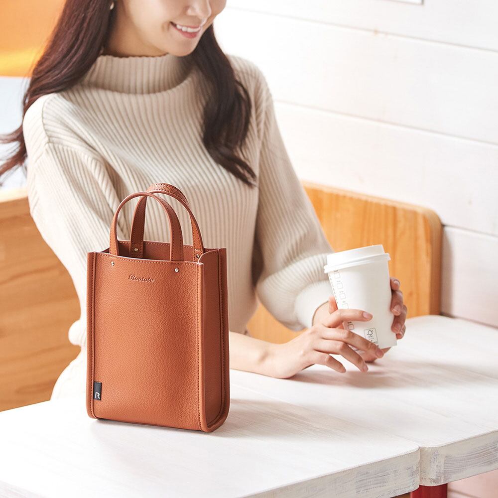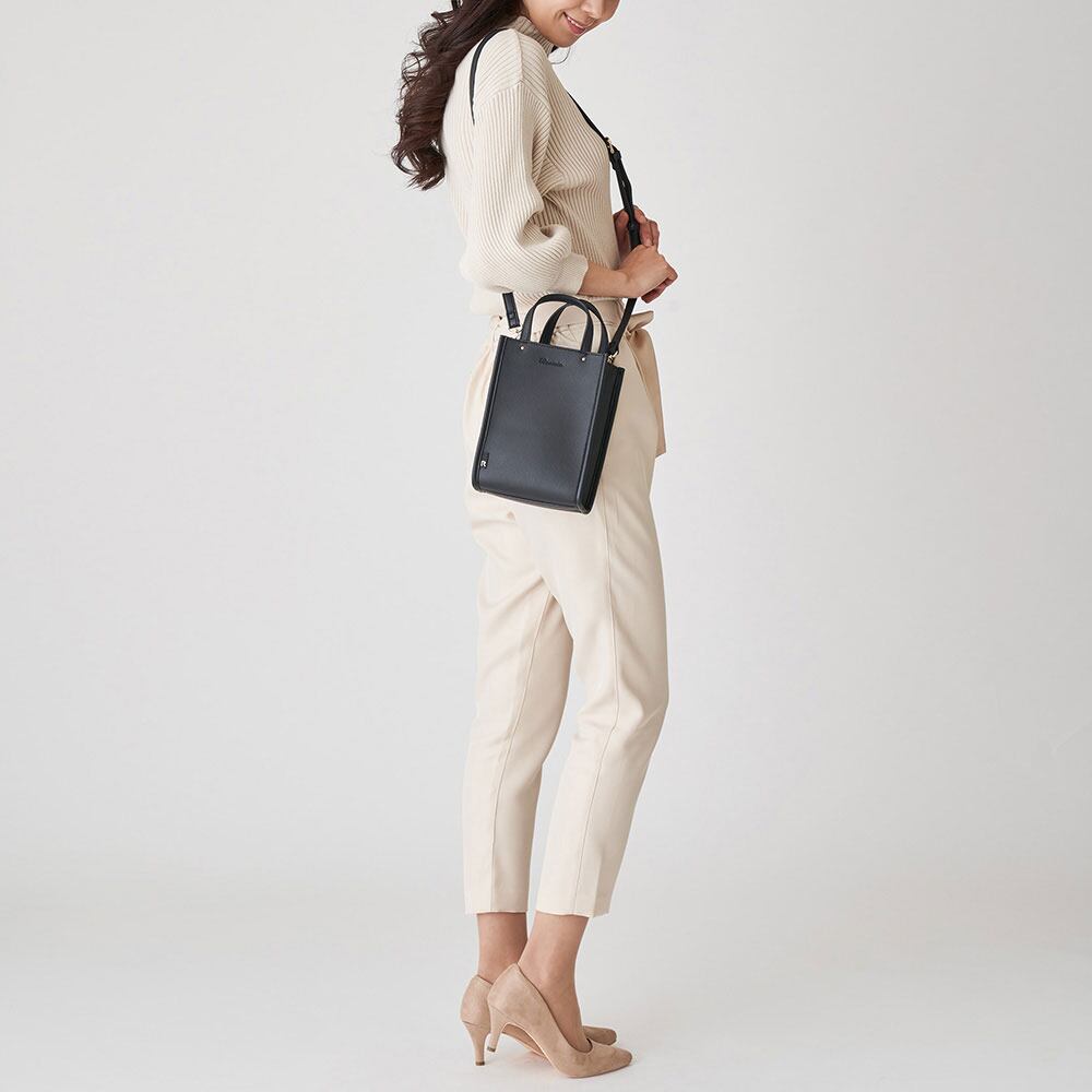 取り外し可能なショルダー付きで、トートバッグ・ショルダーバッグの2wayで使えます。ショルダーは長さ調整ができるので、斜め掛けも可能です。本革のような上質な質感、上品なフォルムを存分に生かしたミニマルなデザイン。