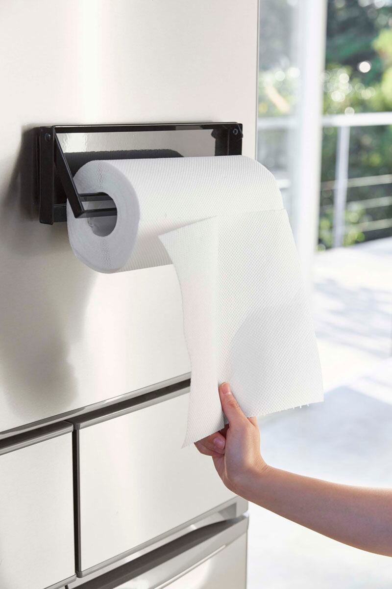 冷蔵庫横に強力マグネットで簡単取り付け。片手でカットできるマグネットキッチンペーパーホルダー。手前にひっぱって下に引くだけの簡単カット。大判タイプの海外製キッチンペーパーロールにも対応しています。