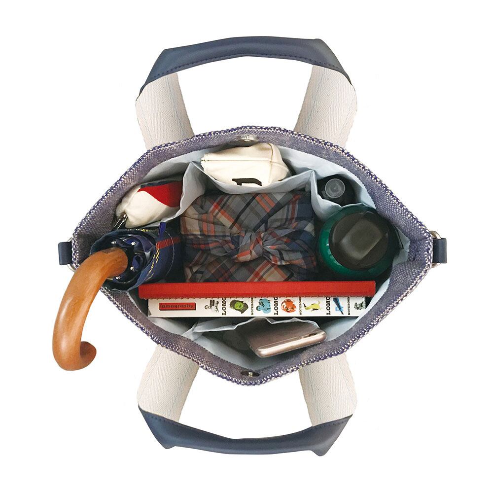 底マチが広く、ランチボックスやボトル、A5ノート、大き目ポーチなど収納力も抜群です。また、サイドに丸カンが付いていて、別売りのストラップを付ければ、ショルダーバッグとしてお使い頂けます。