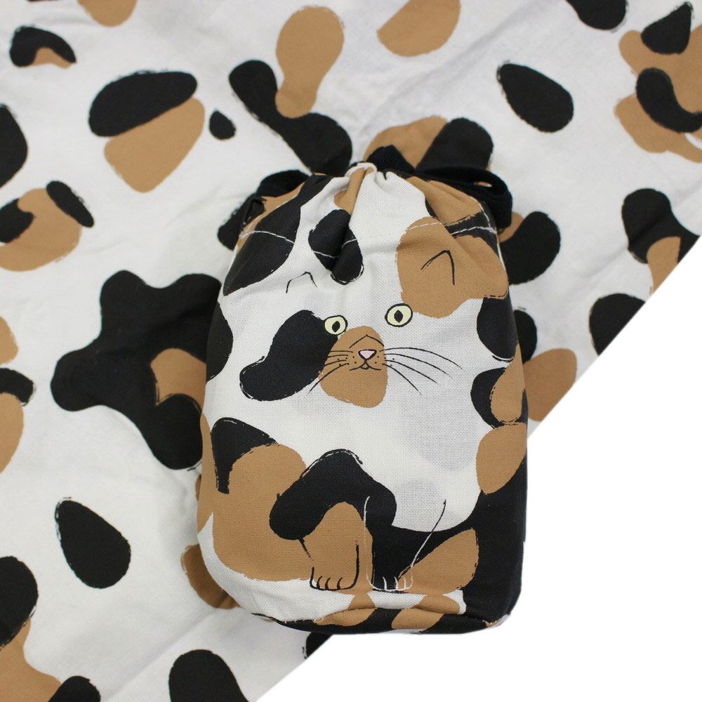 さりげないかわいらしさのネコ柄エコバッグ。使わない時は口元の内ポケットに収納して手のひらサイズに、コンパクトに持ち運びできます。携帯時の巾着ポケットにはちょこんと座ったねこのイラスト。しっぽを振ってご機嫌なうしろ姿もプリントされています。収納用の内ポケットは口元についているので、外袋をなくす心配はありません。
