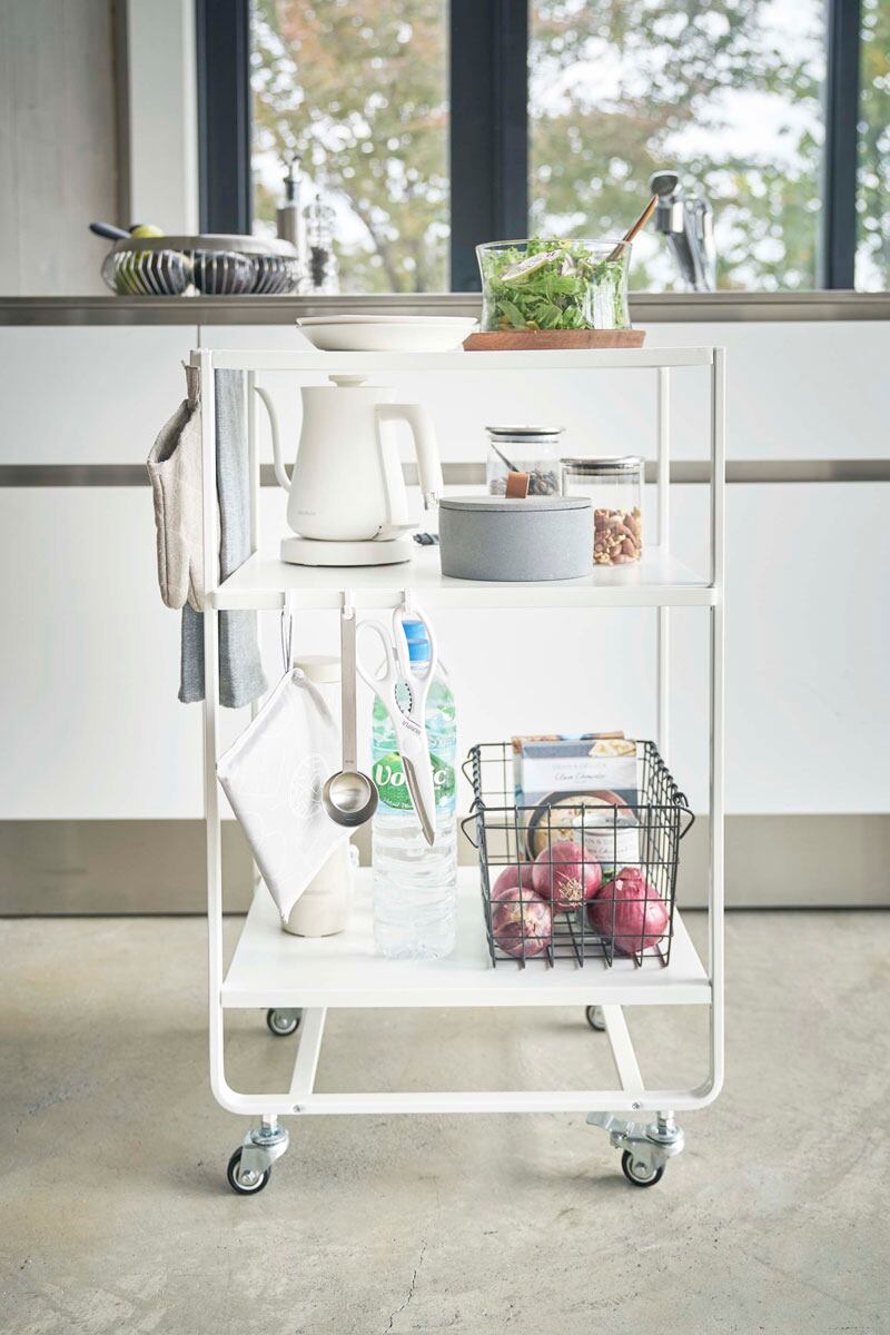 ハンドル付きで移動も簡単。キッチンやリビングで使える3段棚のキャスター付き収納カート。フック付きで、引っ掛けられる小物類の収納にも便利です。