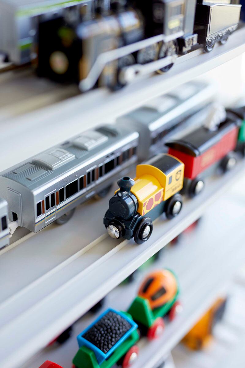 ミニカーやレールトイを飾りながら収納できるディスプレイ棚。トレーは「ミニカー用」と「レールトイ用」の両面仕様なので、持っているおもちゃの量に合わせてトレーを設置できます。ミニカー用トレーはミニカーが並べやすい白線付き。白線内にはレールトイの1車両を収納することもできます。レールトイ用トレーは、レールの上にレールトイを乗せるだけ。