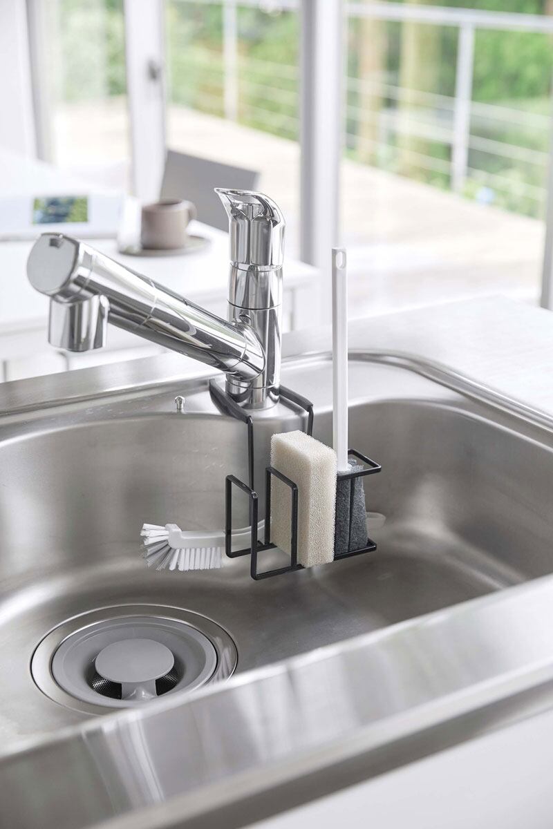 蛇口に掛けるだけの、ずれ落ちないスポンジ&ブラシホルダー。水筒の洗浄等によく使うボトルブラシとスポンジ2個を一括収納します。スチールの取付部がしっかりホールドするので、ずれ落ちることなく快適に使用できます。