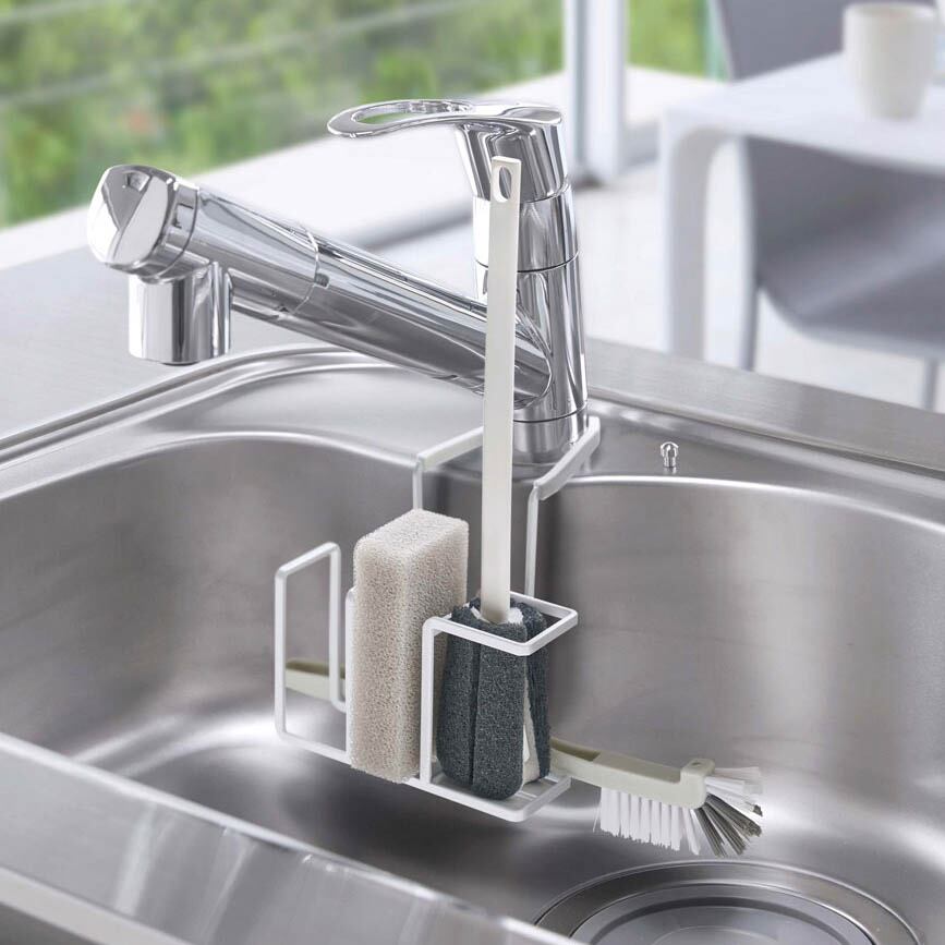 蛇口に掛けるだけの、ずれ落ちないスポンジ&ブラシホルダー。水筒の洗浄等によく使うボトルブラシとスポンジ2個を一括収納します。スチールの取付部がしっかりホールドするので、ずれ落ちることなく快適に使用できます。