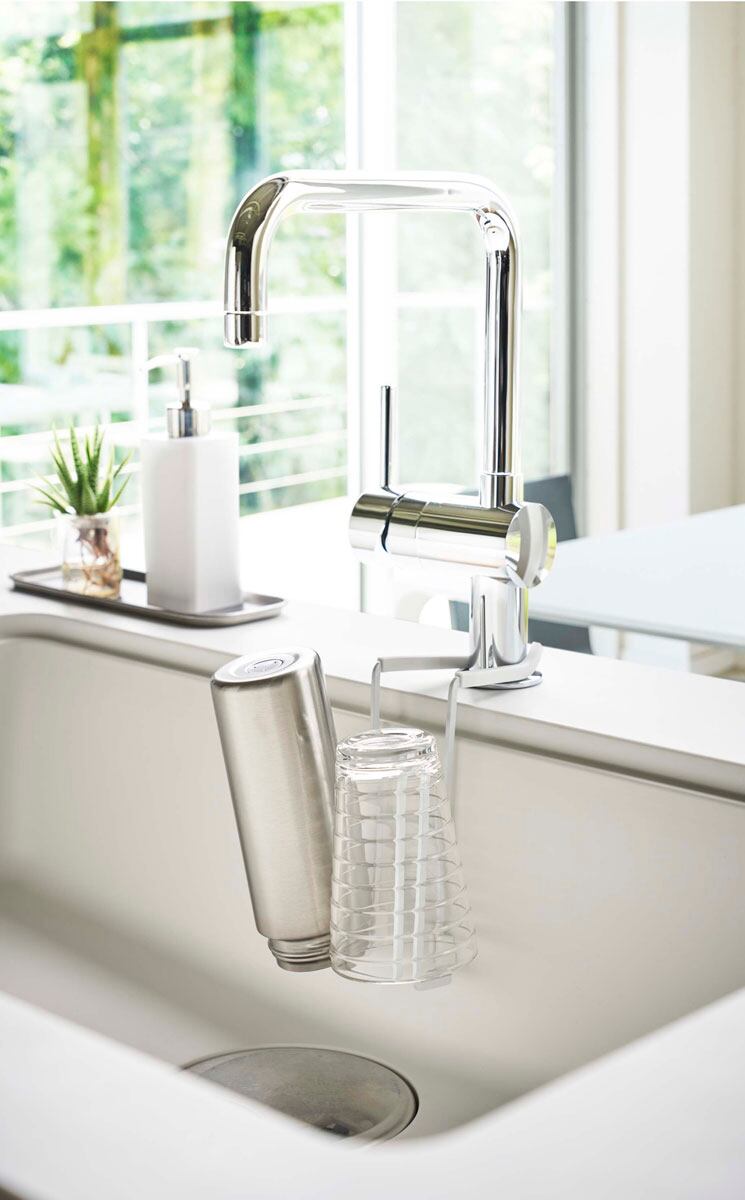 蛇口に掛けるだけ、簡単取り付けのドライホルダー。牛乳パック・ペットボトルを乾かしたり、食品トレーや保存袋を干すことも可能です。シリコーンカバー・クッション付きで、蛇口やシンクを傷つけません。