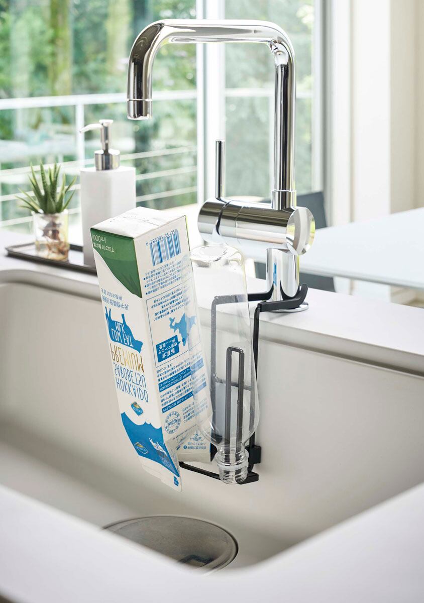 蛇口に掛けるだけ、簡単取り付けのドライホルダー。牛乳パック・ペットボトルを乾かしたり、食品トレーや保存袋を干すことも可能です。シリコーンカバー・クッション付きで、蛇口やシンクを傷つけません。