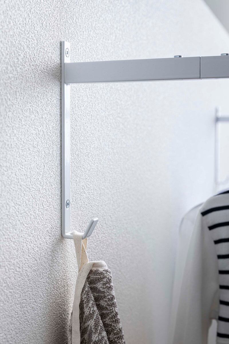 浴室などの扉の木枠や両サイドの下地材に木ネジで簡単取り付け、足りない物干しスペースの確保に便利です。ランドリールームやお部屋の壁に取り付けて室内干しや収納として便利に使用できます。本体は伸縮式なので、様々なサイズの浴室扉前に取り付けられます。引っ掛け収納に便利なフック付き。