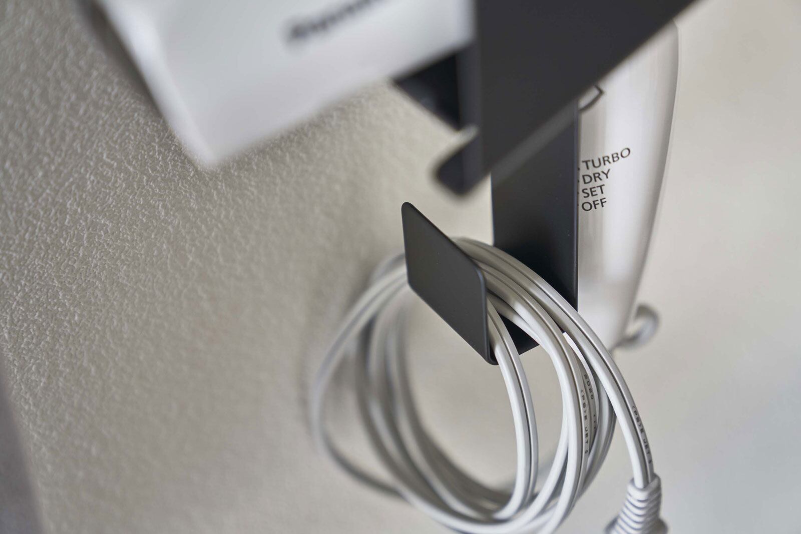 タオルバーに引っ掛けてドライヤーを収納します。ドライヤーは横からサッと入れるだけの簡単収納。コードもまとめてすっきり収納できます。接地面は、シリコーンの滑り止めクッション付きでドライヤーを痛めません。