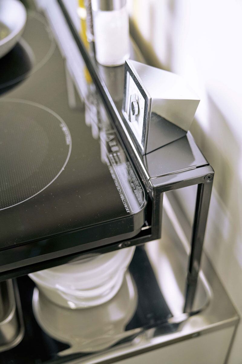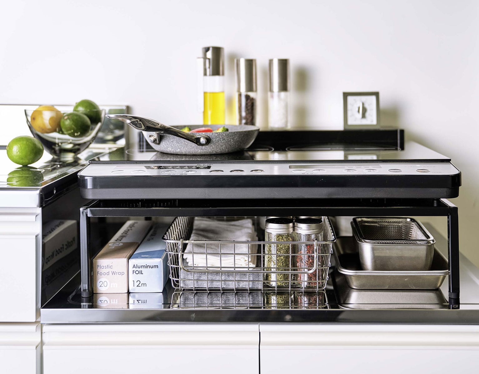 調味料やキッチンタイマーなどの小物が置ける便利な棚付きのIHクッキングヒーターラック。ラック下の収納スペースにはフライパンや調味料ストッカー、調理用トレー、ラップ類などが一括収納できます。