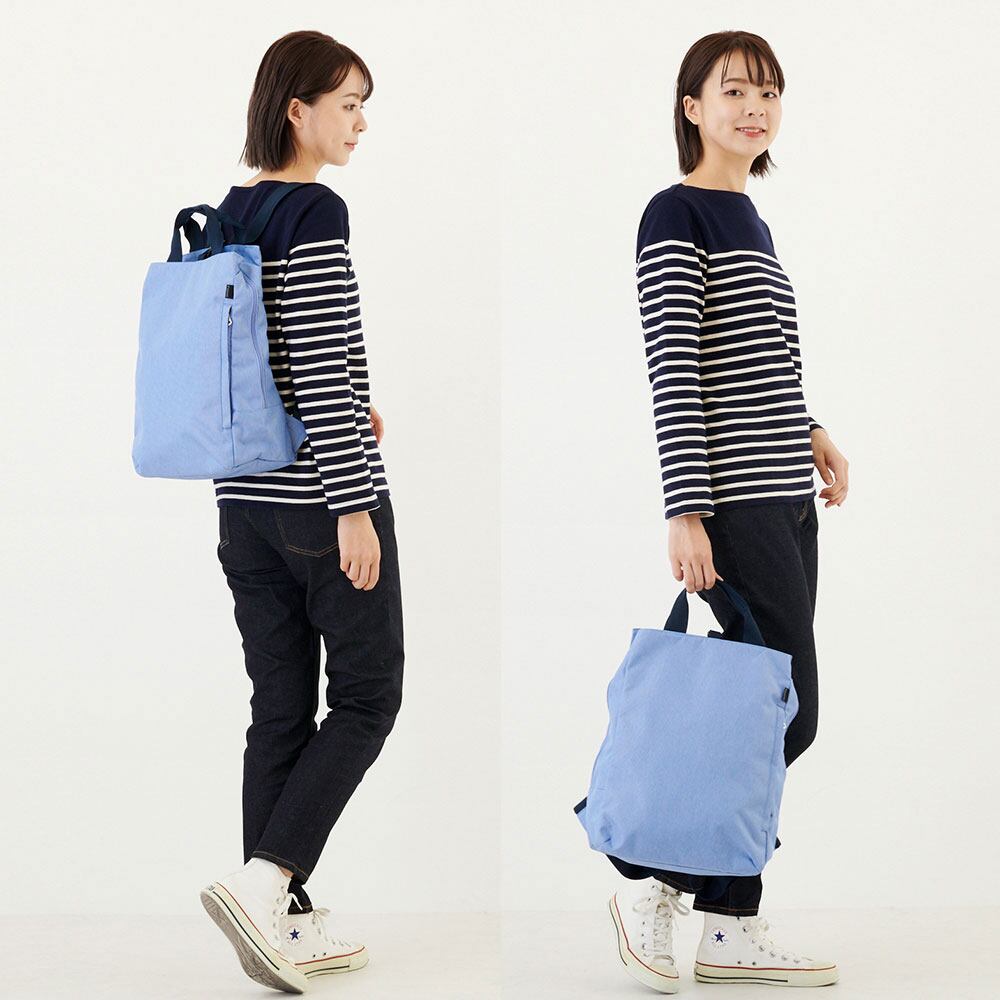 雨の日も晴れの日もデイリーに使える、リュックにもトートにもなる超軽量はっ水素材の2Wayトートです。ベーシックカラーに、ちらりと見えるストライプ柄の裏地が程よいアクセントに。荷物の整理がしやすい二口タイプで、すぐに取り出したいものは、前面のあおりポケットへ。しっかりしまいたい荷物は、ファスナーの中へ収納できます。また、電車内で前に抱えた時に、内ポケットやルーポケットからの小物の出し入れができます。