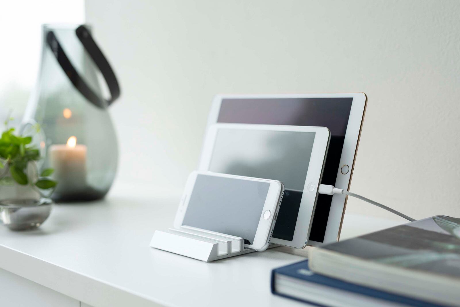 スマートフォンからタブレットPCまで最大6台収納できるタブレットスタンド。アルミ製だから丈夫でスタイリッシュなデザイン。接触面にはシリコーンが付いていてキズを防止してくれます。横向きに収納で、そのまま充電もできます。