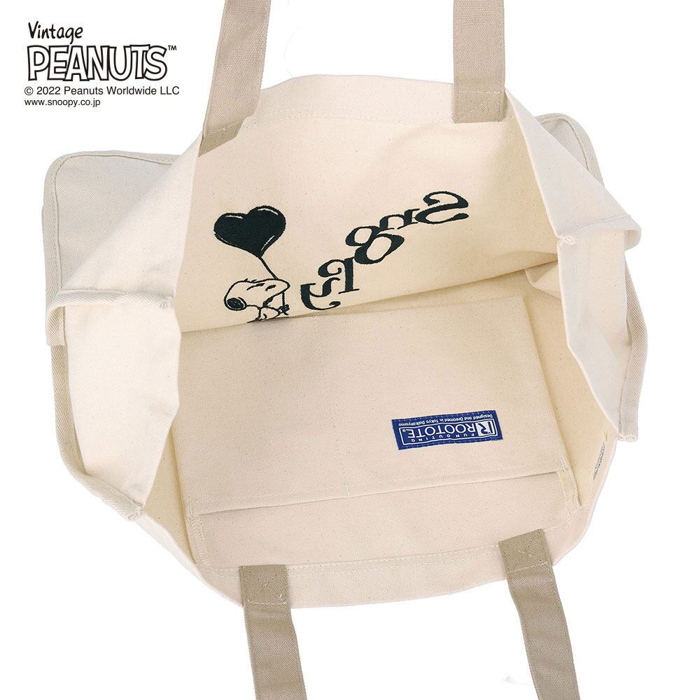 PEANUTSコミックのヴィンテージアートがROOTOTEに。懐かしくて愛らしいPEANUTSキャラクターたちが普段のお出かけをもっと楽しくしてくれます。しっかりしたコットンキャンバス生地に、愛らしいスヌーピーの刺繍がされた大容量のトート。軽くてたっぷり荷物が入るので、荷物が多くなりがちなシーンにも大活躍。