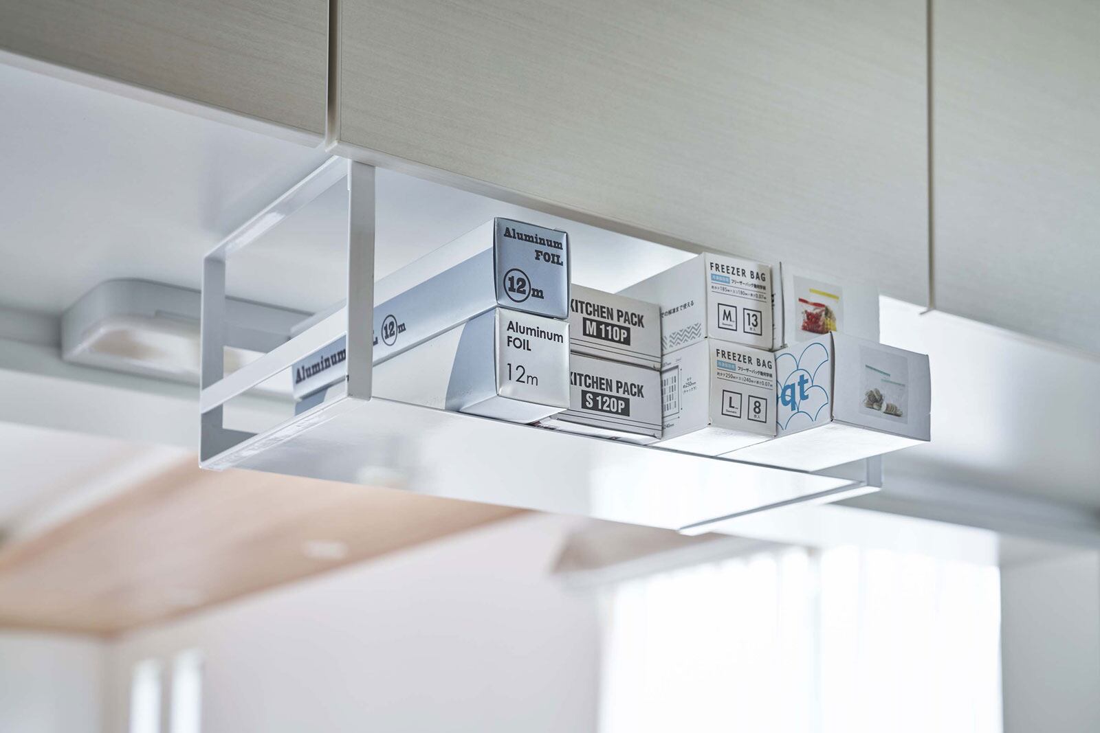 置き場所に困るワイドジャグボトルやマグボトルを戸棚下に並べて収納できる便利な収納ラック。ラップなど長さのあるキッチンアイテムの収納にも便利です。引っ掛け収納に便利なフック付きでお届けします。