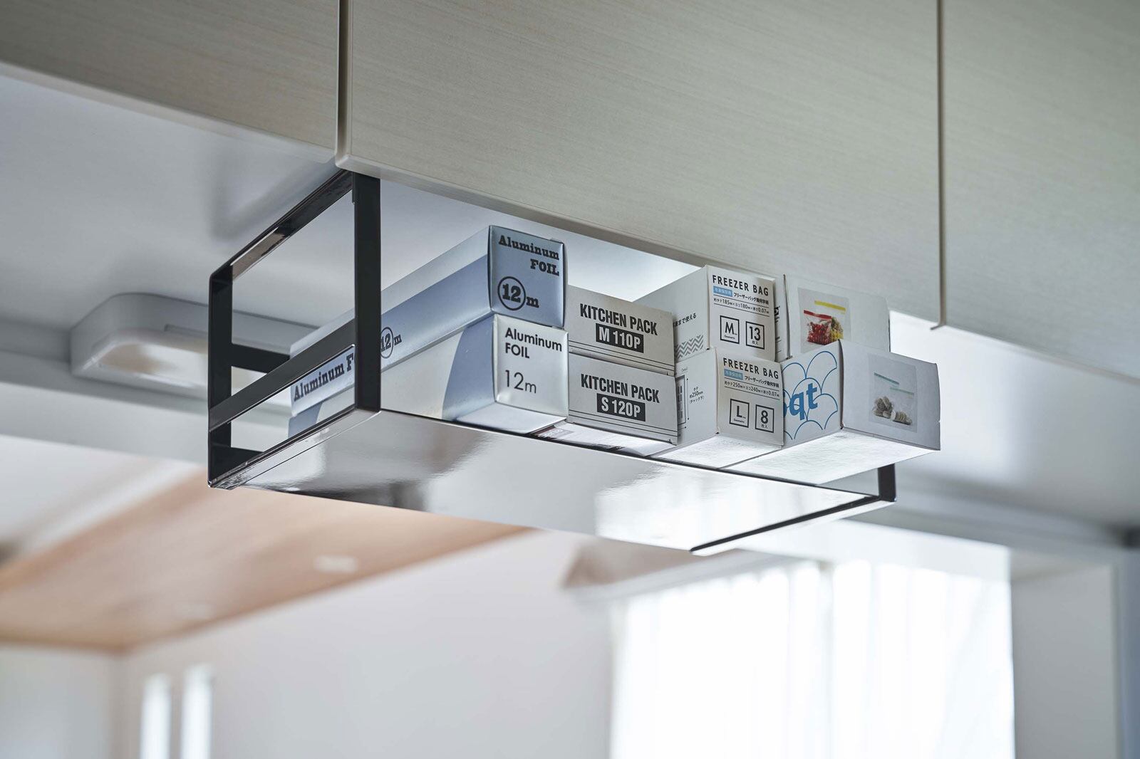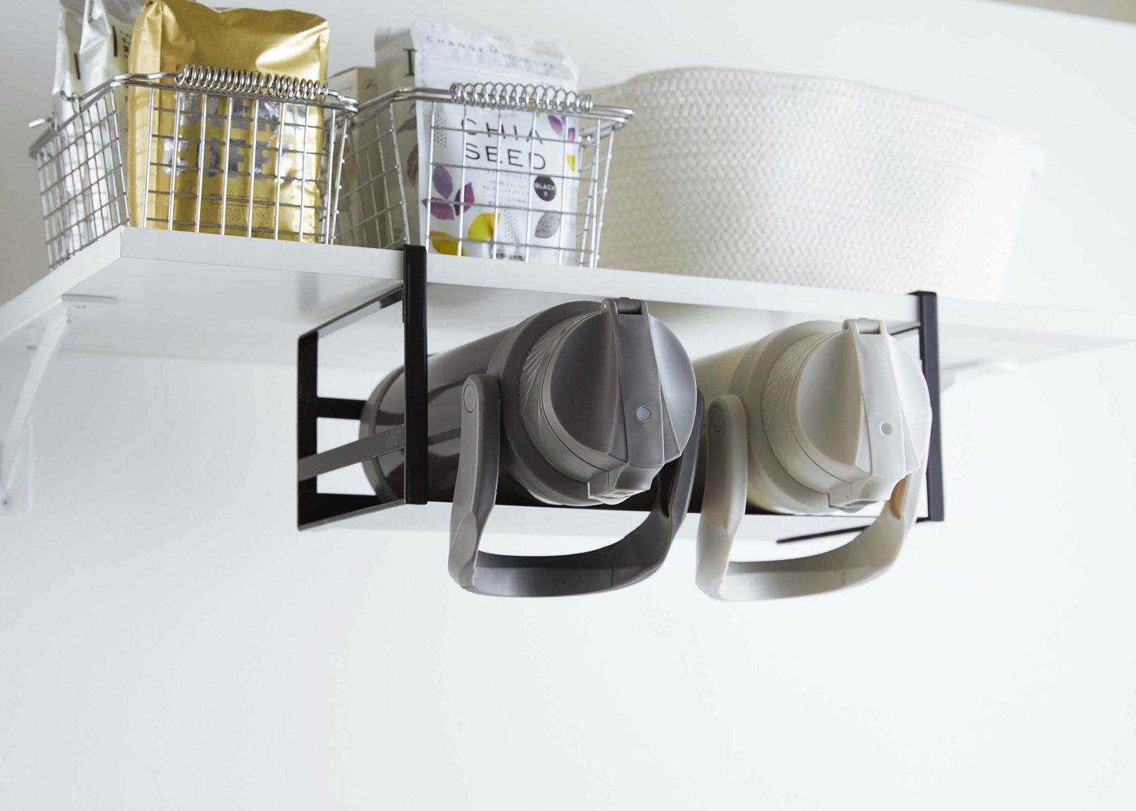 置き場所に困るワイドジャグボトルやマグボトルを戸棚下に並べて収納できる便利な収納ラック。ラップなど長さのあるキッチンアイテムの収納にも便利です。引っ掛け収納に便利なフック付きでお届けします。