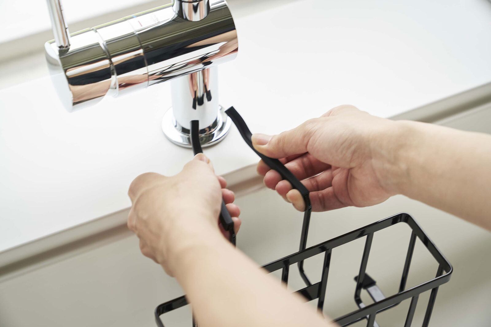 蛇口に挟み込むだけの簡単取り付け。スポンジ、食器用洗剤、除菌スプレーなどシンクまわりの小物を一括収納可能なフリーラックです。シリコーンカバー付きなので、蛇口やシンクを傷つけにくい。また、後部には長いボトルブラシなども収納できます。