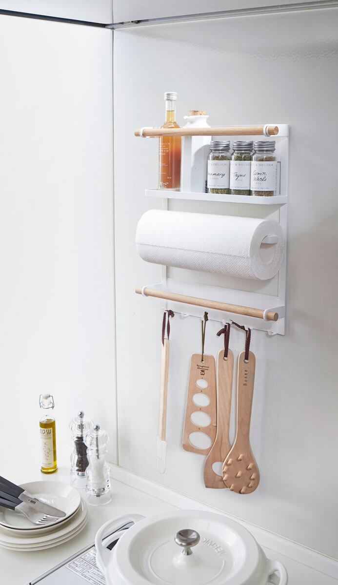 冷蔵庫の側面など磁石のくっつく平らな面に簡単取り付けで、散らかりがちなキッチン小物などをすっきり収納します。冷蔵庫の側面など、空きスペースに簡単設置、スペースを有効活用します。