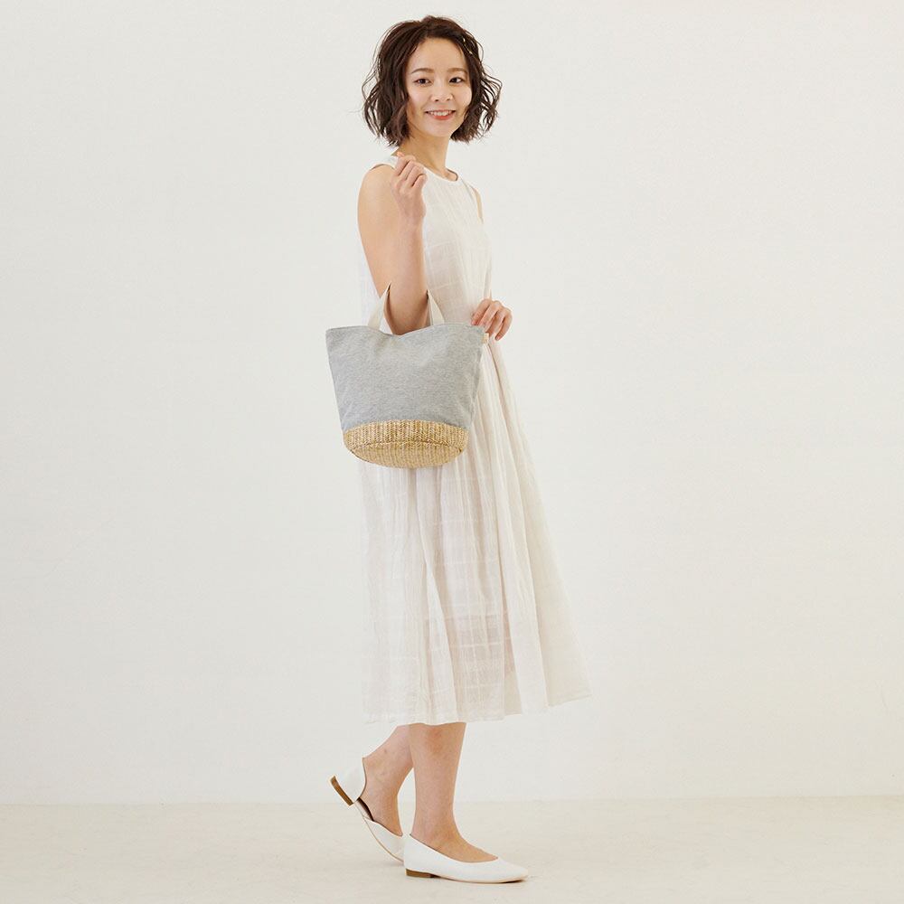 優しい風合いのメランジ調コットンテンジクを使用した、ナチュラルでリラックス感のあるトートバッグ。底面はカゴをイメージした夏らしいデザイン。マチもたっぷり、たくさん荷物が入って収納力抜群。ランチボックス、ボトル、大き目ポーチなどらくらく入ります。どんなファッションにも合わせやすく、季節を問わず大活躍です。