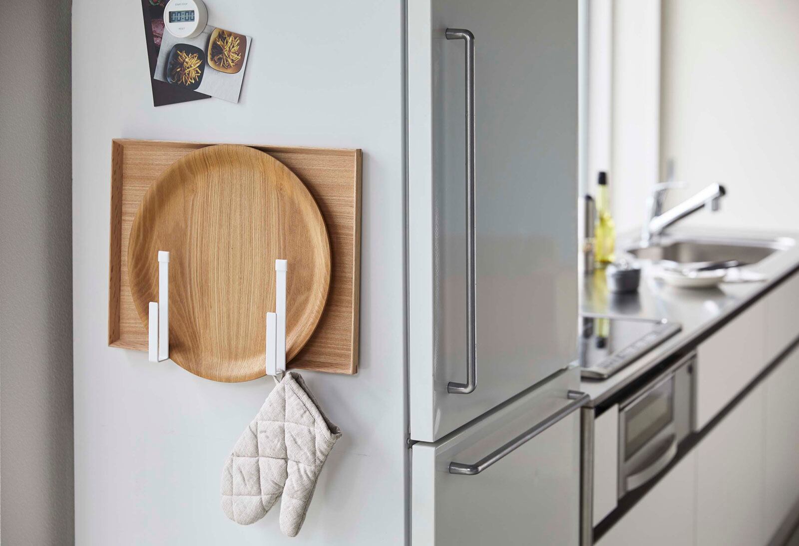 収納するものの大きさに合わせて幅を調整できる2個組のマグネット式トレーホルダー。置き場所に困るキッチントレーをマグネットで一括収納します。円形のトレーにも対応。また、トレー収納のほか、オーブン天板やトースター天板の収納、レシピホルダーとしても活用いただけます。