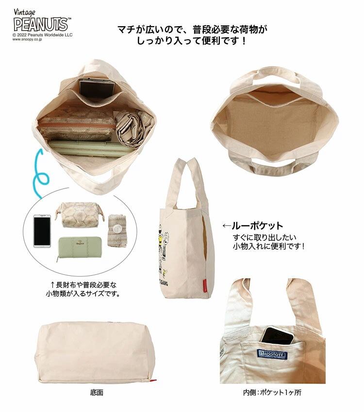機能とシンプルさを追求した形状のスヌーピーバッグ。小物の収納に便利な外ポケットや、裏地が無いのに縫い目が表に響かない内ポケットなど、細部にまでこだわったつくり。くたっと馴染みの良いコットン素材で、幅広い年代のカジュアルスタイルにマッチします。