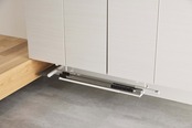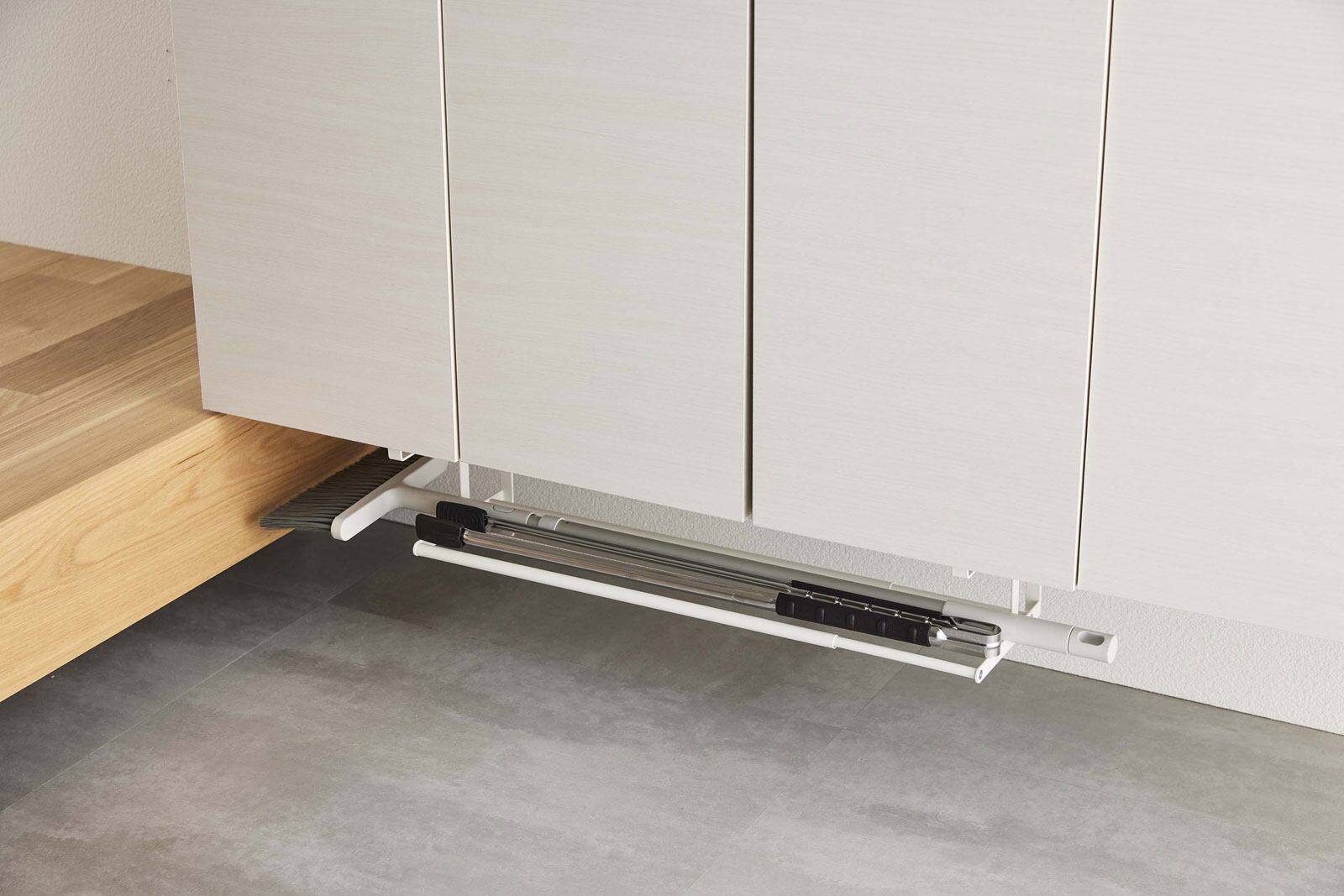 玄関の下駄箱の下に、左右のフック部分を差し込むだけの簡単設置。伸縮自在で大人用のシューズ、サンダル、ヒール靴など2〜4足を収納します。靴、掃除道具などの長物を浮かせて収納するので、床の掃除もラクラクです。また、棚に差し込んで傘や掃除用具などを引っ掛けて収納もできます。