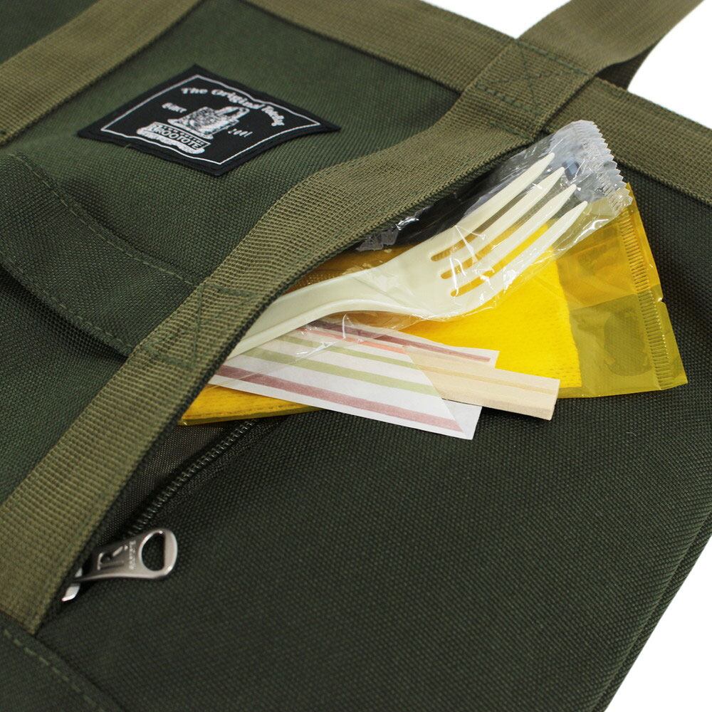 内側メッシュポケットは反対側のホックで留めて、宙吊りポケットにできます。吊りポケットには、凍らせたペットボトルを入れて、上からの位置で保冷することもできます。