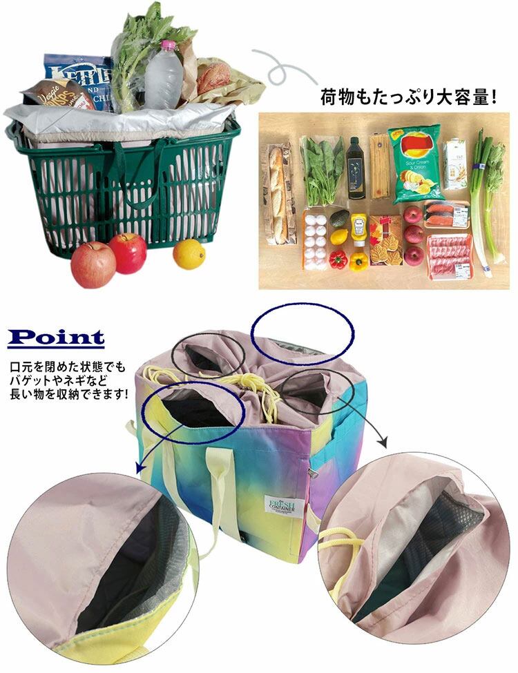 簡易保冷機能付きトートバッグ。軽量な素材で、コンパクトになり持ち運びしやすいので、お買い物やレジャー、ピクニックに大活躍します。口元を巾着で閉めることができて、中に入れた荷物が飛び出る心配がありません。また、内側には大きなメッシュポケット付きで、保冷剤の収納はもちろん、収納物を固定することもできます。