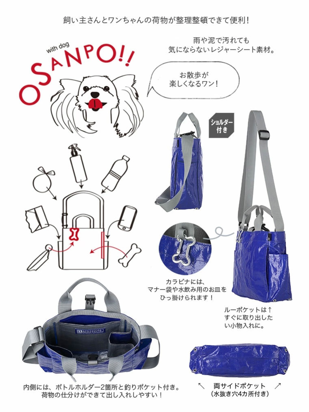 愛犬とのお散歩バッグ。雨に強い、汚れに強いレジャーシート素材でできているので、お天気を気にせず、雨の日も晴れの日も毎日使える頼もしいトートです。お散歩に持っていきたい、マナー袋、水、スプレー、ウェットティッシュ、おやつ、水飲み用お皿など、たくさんの荷物を整理整頓しやすく、取り出しやすさを考えた、お散歩に便利な2wayトートバッグです。