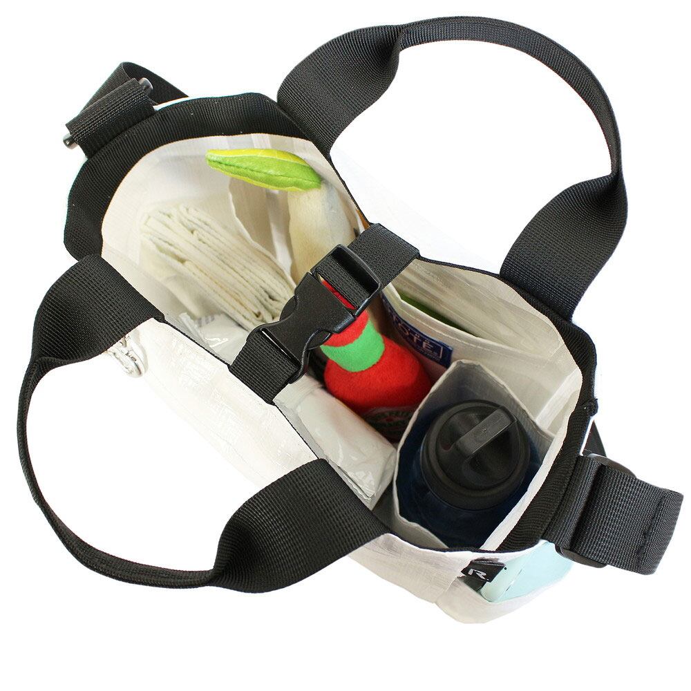 愛犬とのお散歩バッグ。雨に強い、汚れに強いレジャーシート素材でできているので、お天気を気にせず、雨の日も晴れの日も毎日使える頼もしいトートです。お散歩に持っていきたい、マナー袋、水、スプレー、ウェットティッシュ、おやつ、水飲み用お皿など、たくさんの荷物を整理整頓しやすく、取り出しやすさを考えた、お散歩に便利な2wayトートバッグです。