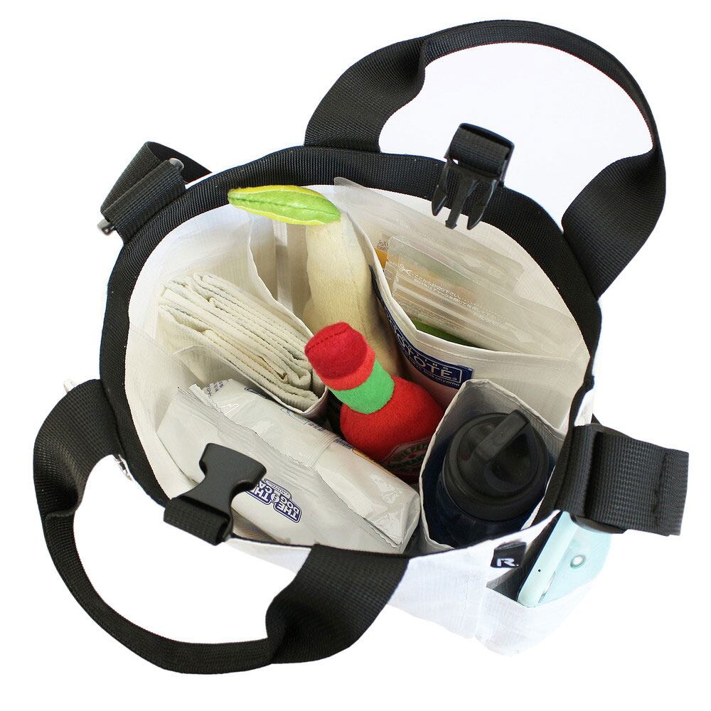 愛犬とのお散歩バッグ。雨に強い、汚れに強いレジャーシート素材でできているので、お天気を気にせず、雨の日も晴れの日も毎日使える頼もしいトートです。お散歩に持っていきたい、マナー袋、水、スプレー、ウェットティッシュ、おやつ、水飲み用お皿など、たくさんの荷物を整理整頓しやすく、取り出しやすさを考えた、お散歩に便利な2wayトートバッグです。