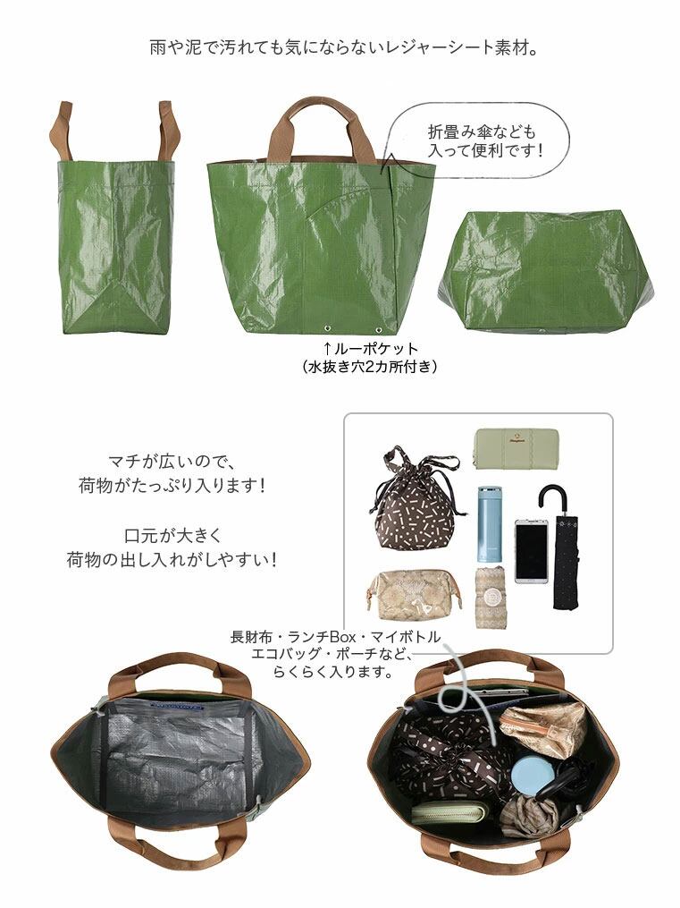雨に強い、汚れに強いレジャーシート素材でできているので、お天気を気にせず、雨の日も晴れの日も、毎日使える頼もしいトートバッグ。日常生活から、楽しいレジャーやアウトドアまで、様々なシーンで活躍します。外ポケットは、折りたたみ傘の収納を意識したフォルム。濡れた折りたたみ傘を入れても良いように、下部に水抜きのハトメが付いています。