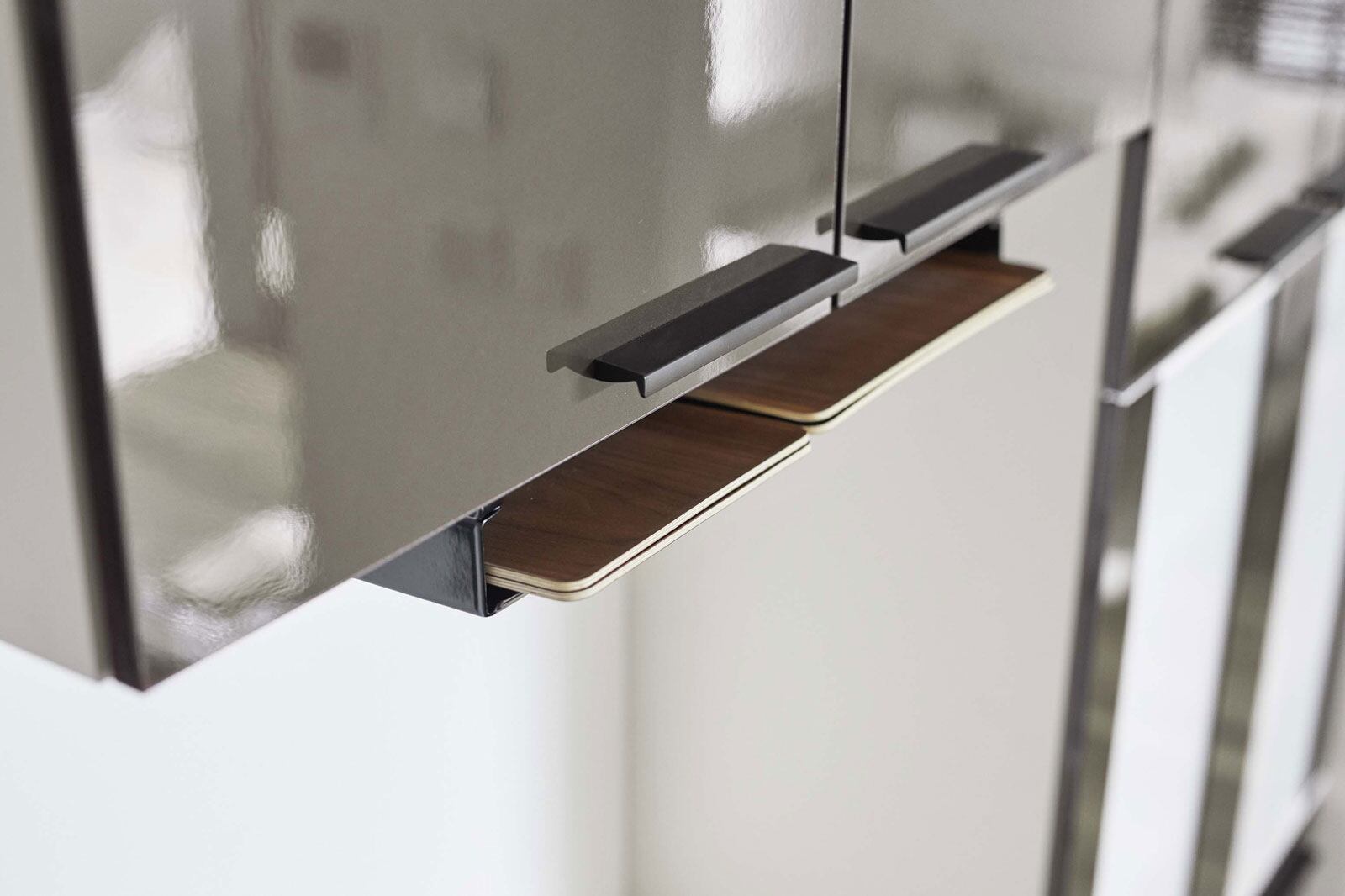 棚板に差し込むだけの簡単設置で、置き場所に困るランチョンマットを戸棚下に一括収納します。取り出し口は少し斜めに上がっていて、大きめのランチョンマットを収納しても垂れ下がりにくい構造になっています。開口部が広く、ランチョンマットの他にトレーやポリ袋なども収納できます。