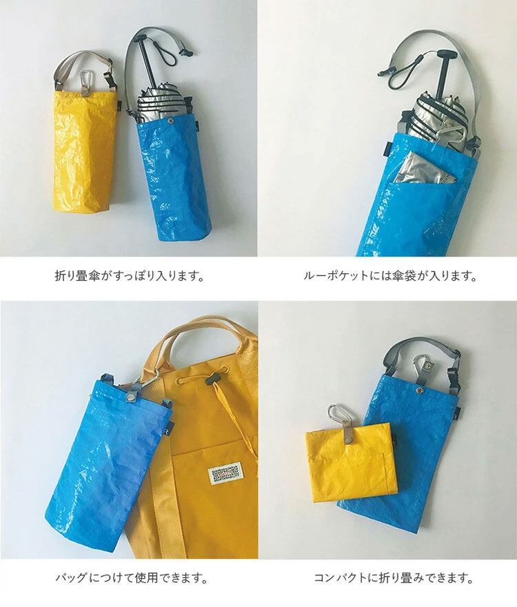 雨や泥で汚れても気にならないレジャーシート素材でできた傘用トートバッグ。引っ掛けて便利なカラビナ付き。背面のルーポケット(外ポケット)には、折り畳み傘の外袋を収納できます。