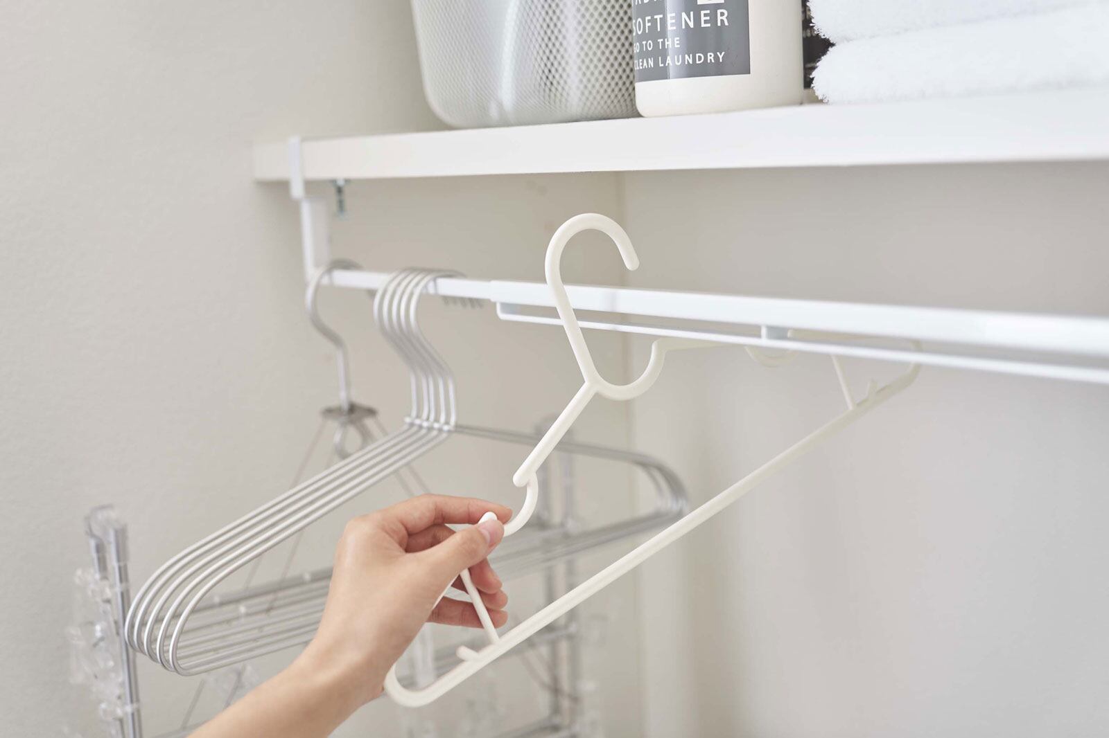 洗濯機上の棚に取り付けてスペースを有効活用します。収納場所に合わせて横幅を調整できる伸縮収納ハンガーで、ハンガー、ピンチハンガー、スプレー、洗濯小物などを引っかけて、まとめて一括収納します。小物を収納できる便利なフック付きでお届けします。