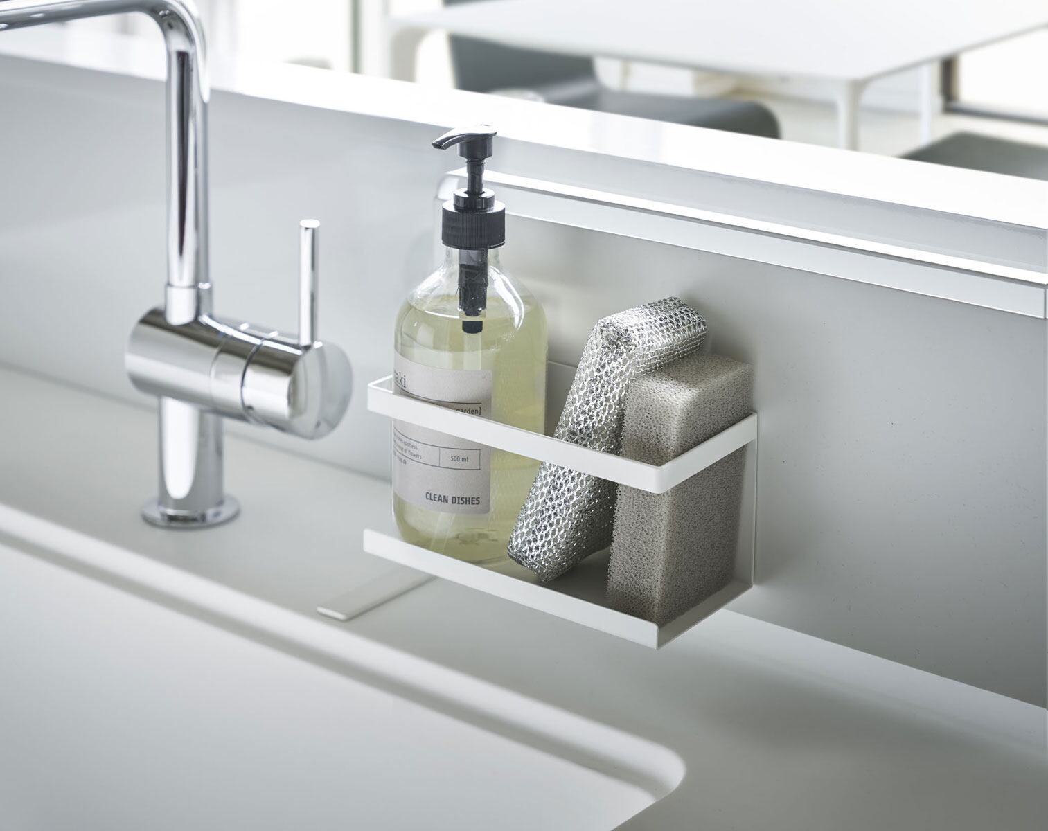 マグネットが付くキッチンパネルや冷蔵庫横に簡単取り付けできるキッチンラック。調味料入れはもちろん、シンク周りのスポンジや洗剤ボトルの収納に便利です。