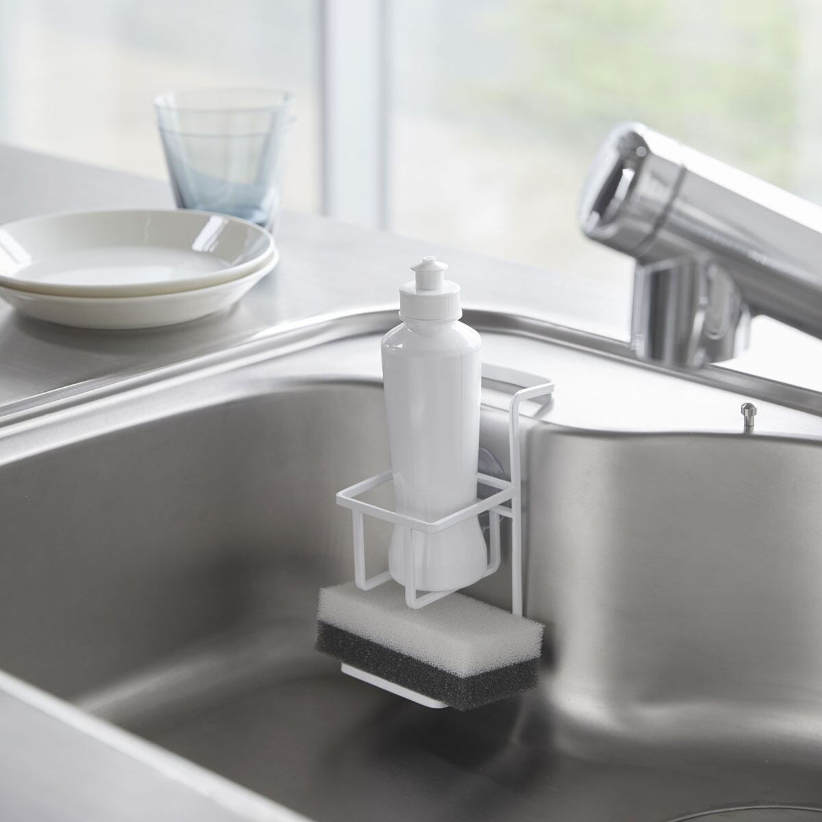 台所用洗剤ボトルとスポンジをまとめてシンクにコンパクト収納できます。引っ掛かり部分にはシリコンの滑り止めが付いているので、吸盤と同時にシンクの端に引っ掛けることで外れにくい構造になっています。