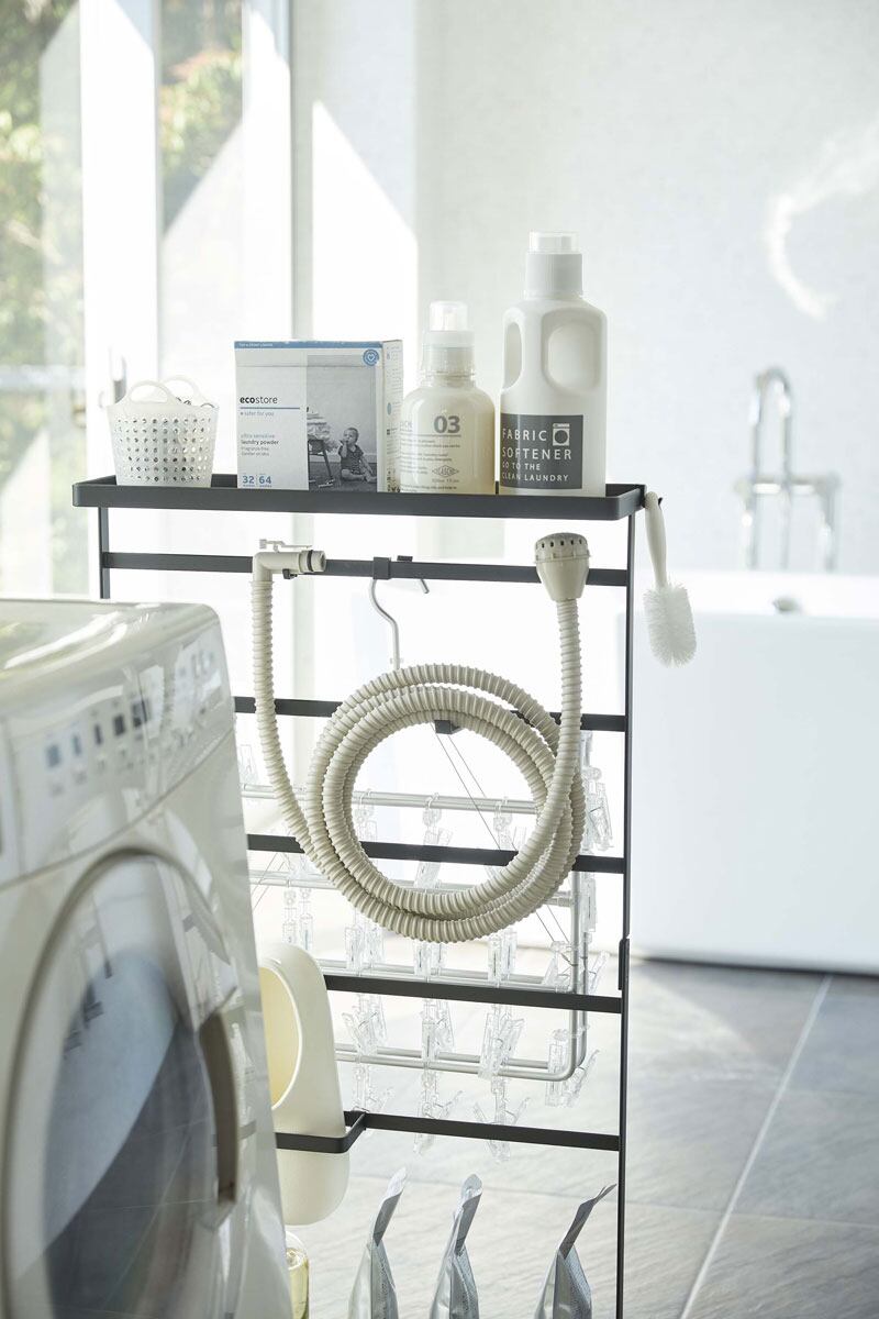 洗濯用洗剤、ハンガー、小物類などのランドリーグッズをまとめて収納できるスリムな大容量ワゴンです。付属のフックや引っ掛けホルダーで自分仕様にアレンジして収納。キャスター付きだから掃除の際の移動も簡単です。