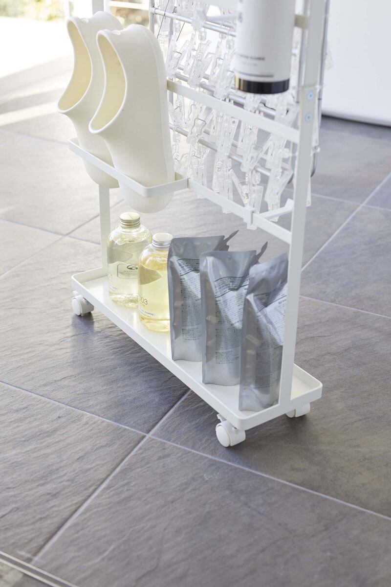 洗濯用洗剤、ハンガー、小物類などのランドリーグッズをまとめて収納できるスリムな大容量ワゴンです。付属のフックや引っ掛けホルダーで自分仕様にアレンジして収納。キャスター付きだから掃除の際の移動も簡単です。
