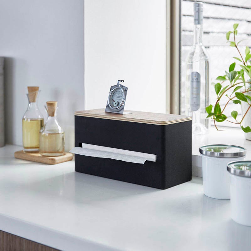 ティッシュペーパーやペーパータオル、厚型ティッシュボックスなど用途に合わせた使い方ができる、RIN 両面ティッシュケース。両サイドに取り出し口、中には可動式の仕切りがあるから、用途に合わせて2種類のペーパーを使い分けができる、便利な蓋付き収納ケースです。