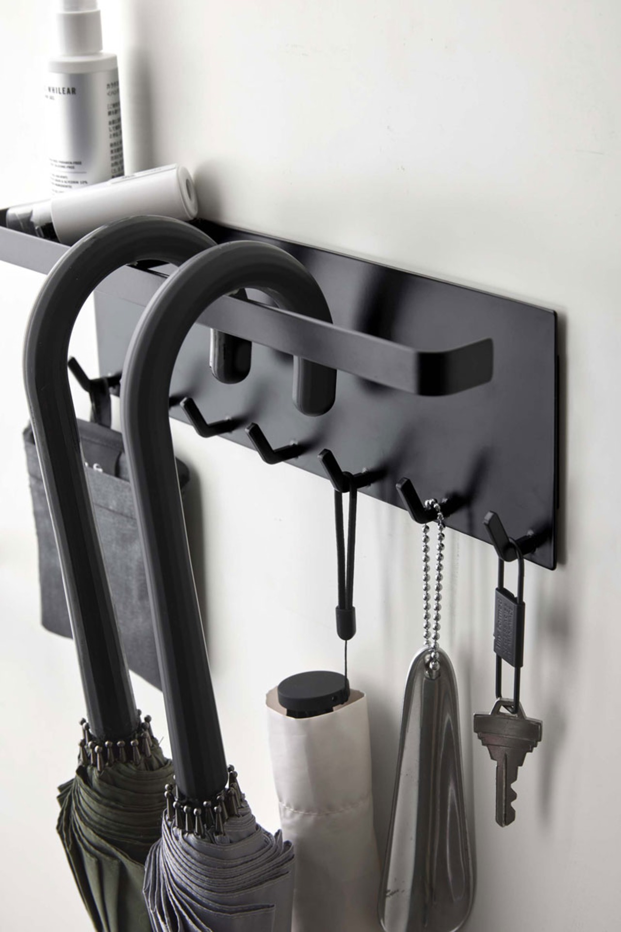 スチール製の玄関扉にマグネットで簡単取り付け。傘や折り畳み傘をサッと引っ掛けて収納できます。トレー付きで印鑑や除菌グッズの収納もできて便利。フックには帽子やマスク、小物類をひとまとめにして、お出かけの際にサッと準備できます。